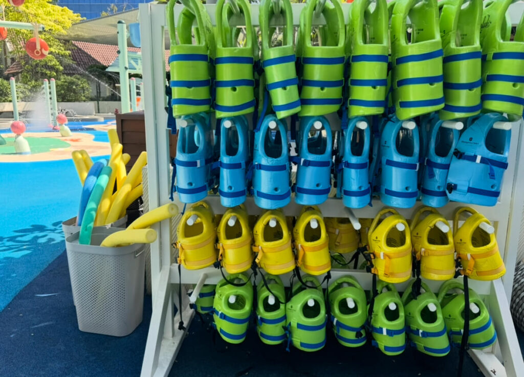 このライフジャケットはプールサイドで無料で貸し出ししています。