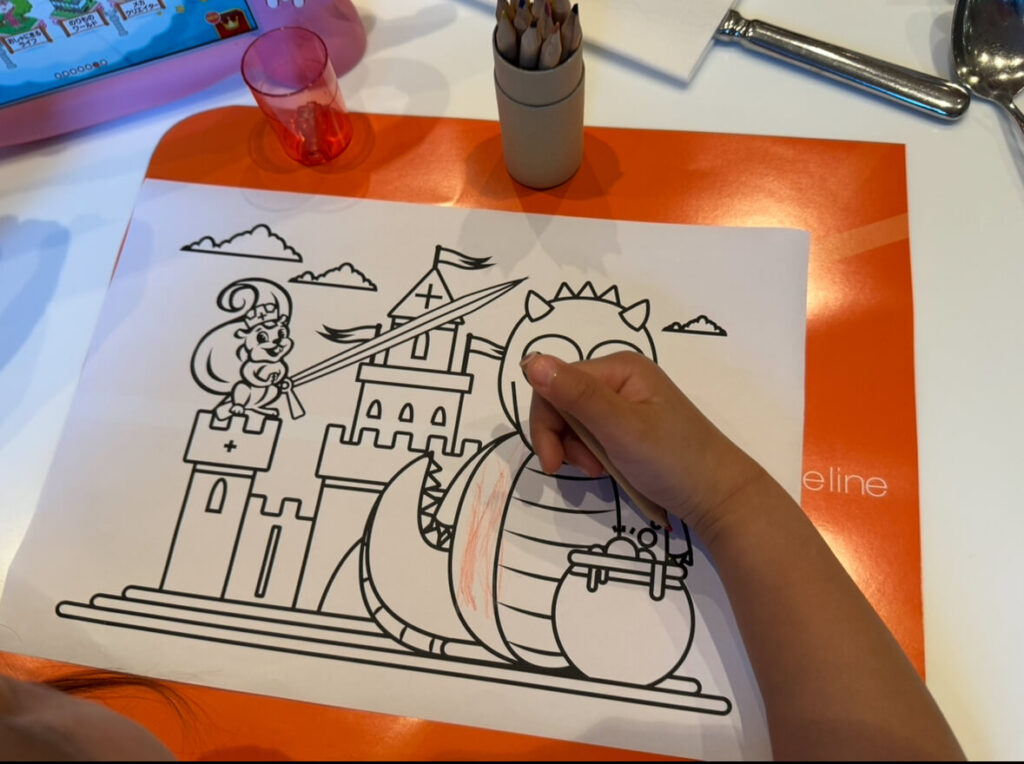 お絵描きセット(塗り絵とたくさんの色鉛筆)が入り口に用意されています。
