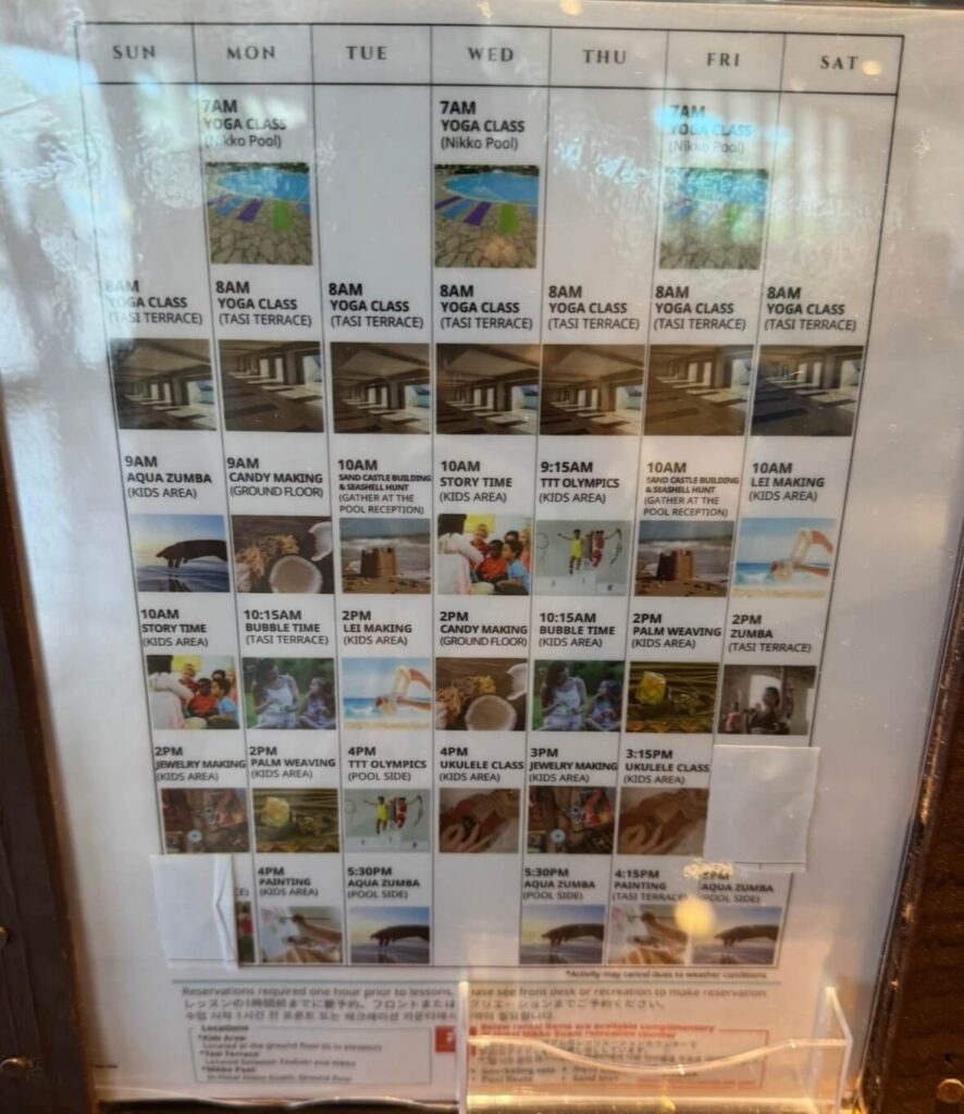 今回は残念ながら参加できませんでしたが、ウクレレレッスンやレイ作りなど、グアムらしいアクティビティも開催されています。次回はイベント日に合わせてスケジュールを組んであげたいなと思いました。
